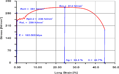 The Lateral Strain-Longitudinal Strain-Diagram shows a uniformly shaped curve. The bent area around 2 - 5 % longitudinal strain is caused by the differend measuring ranges for the Lueders bands.