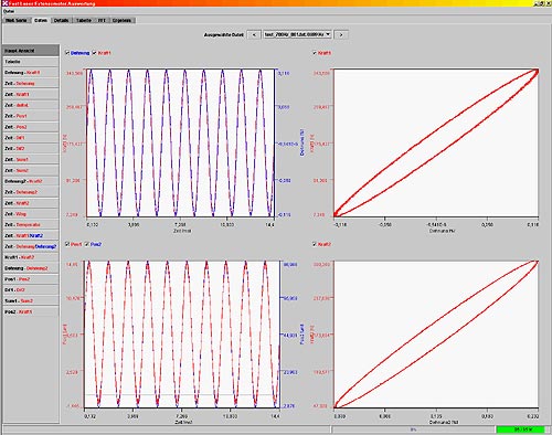 Die Software stellt Kraft und Dehnung sowie die Positionssignale dar.