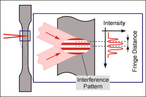 Zwei kohärente Laserstrahlen schneiden sich unter einem definierten Winkel. Das Schnittvolumen wird auf der Probenoberfläche positioniert. Die Wellenfronten beider Strahlen interferieren im Schnittvolumen und erzeugen ein Interferenzmuster. Der Abstand der Streifen des Interferenzmusters hängt von der Wellenlänge des Lasers und dem Schnittwinkel beider Strahlen ab und ist damit bekannt.