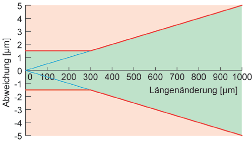 Die Genauigkeitsklasse 0.5 bedeutet, daß die Abweichung kleiner als 0.5 % des Meßwerts sein muß. Bei sehr kleinen Längenänderung kann eine prozentuale Grenze nicht von realen Meßsystemen erfüllt werden. Aus diesem Grund gilt für kleine Längenänderung nicht die prozentuale Grenze sondern eine absolute Grenze. Diese absolute Grenze gilt für Längenänderungen von 0 bis 300 µm, bei größeren Werten gilt die prozentuale Grenze. Die untenstehende Abbildung verdeutlicht die zur Kalibrierung herangezogenen Grenzen. Es wird ein Bereich von ± 3 x 0.5 µm (obere blaue rechteckige Fläche), sowie ein Bereich von ± 0.5 % (untere blaue dreieckige Fläche) vereint. Als Ergebnis entsteht die grüne Fläche, wie sie auch in der oberen Abbildung zu sehen ist.