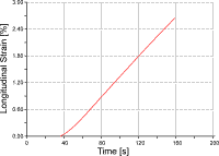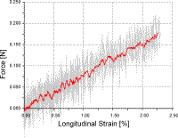 The experiments were carried out at a tensile testor with a 500 N load cell. Since the maximum load was only 0.2 N, the force signal was rather noisy. The red curve shows the result of a moving average. The laser extensometer P-50 used for this experiment has a scanning range of 50 mm, a resolution of 0.1 µm and an accuracy class 0.2 (DIN/EN 10002-4). Because of the contact free measuring principle the specimen is neither influenced by the laser extensometer, nor is the measurement falsified by gliding or similar phenomena. The laser extensometer P-50 is especially suited for materials with small deformati-ons like glass fibers, fiber reinforced materials, high-strength steel, concrete and others. |