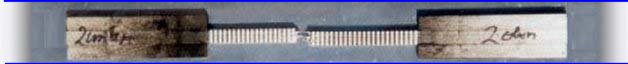 Strain MeasurementA laser extensometer type P-100 was used to measure strain at wood specimen. The specimen was equipped with a grid of markers made from black powder. For marking, the powder is suspended in ethanol. When spraying the specimen, the ethanol evaporates and only dry powder reaches the specimen. This marking technique garuantees that the specimen is not influenced by fluids, glues or other materials which could otherwise significally affect the behaviour of the wood under test. Stress-Strain Diagram and Derivative (Modulus)