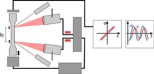 The computer records the position signals of both markers and the load signal with correct phase information. Based on measuring length and position information the strain is calculated. |