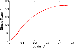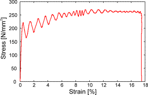 The following figures show the results from a measurement at an aluminum alloy sample. The sample shape was 8 mm x 4 mm (width x depth) and the testing speed was approximately 6 m/s. The first figure depicts the stress strain diagram. The typical ringing of the force signal can clearly be seen: